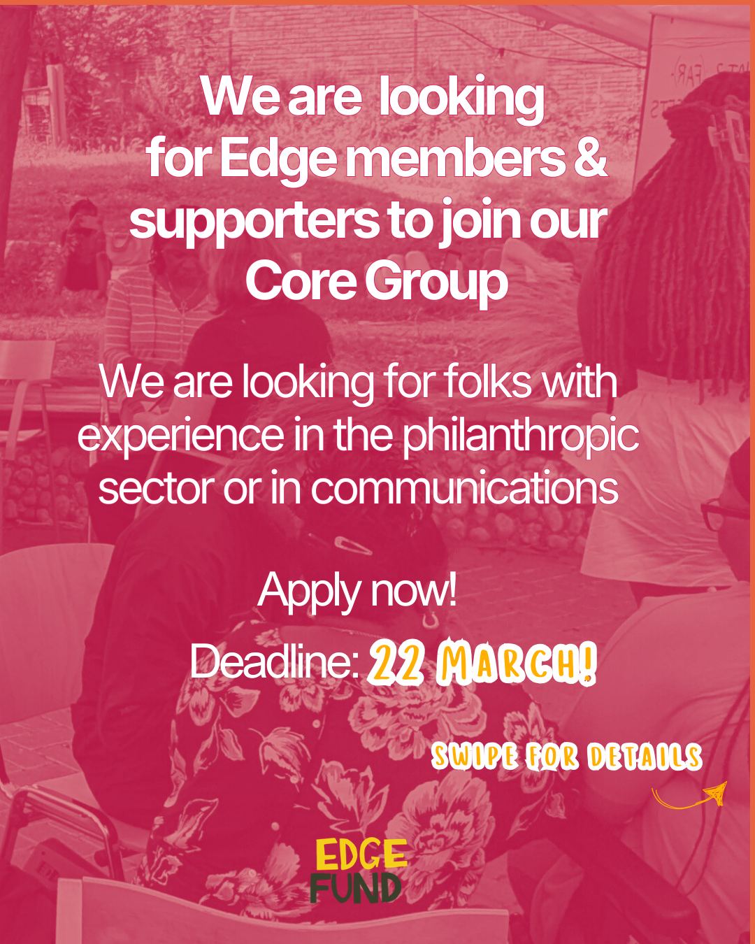 At Edge we have identified the need to expand our Core Group with two roles dedicated specifically to improving our work in two main areas: Fundraising and Communications.