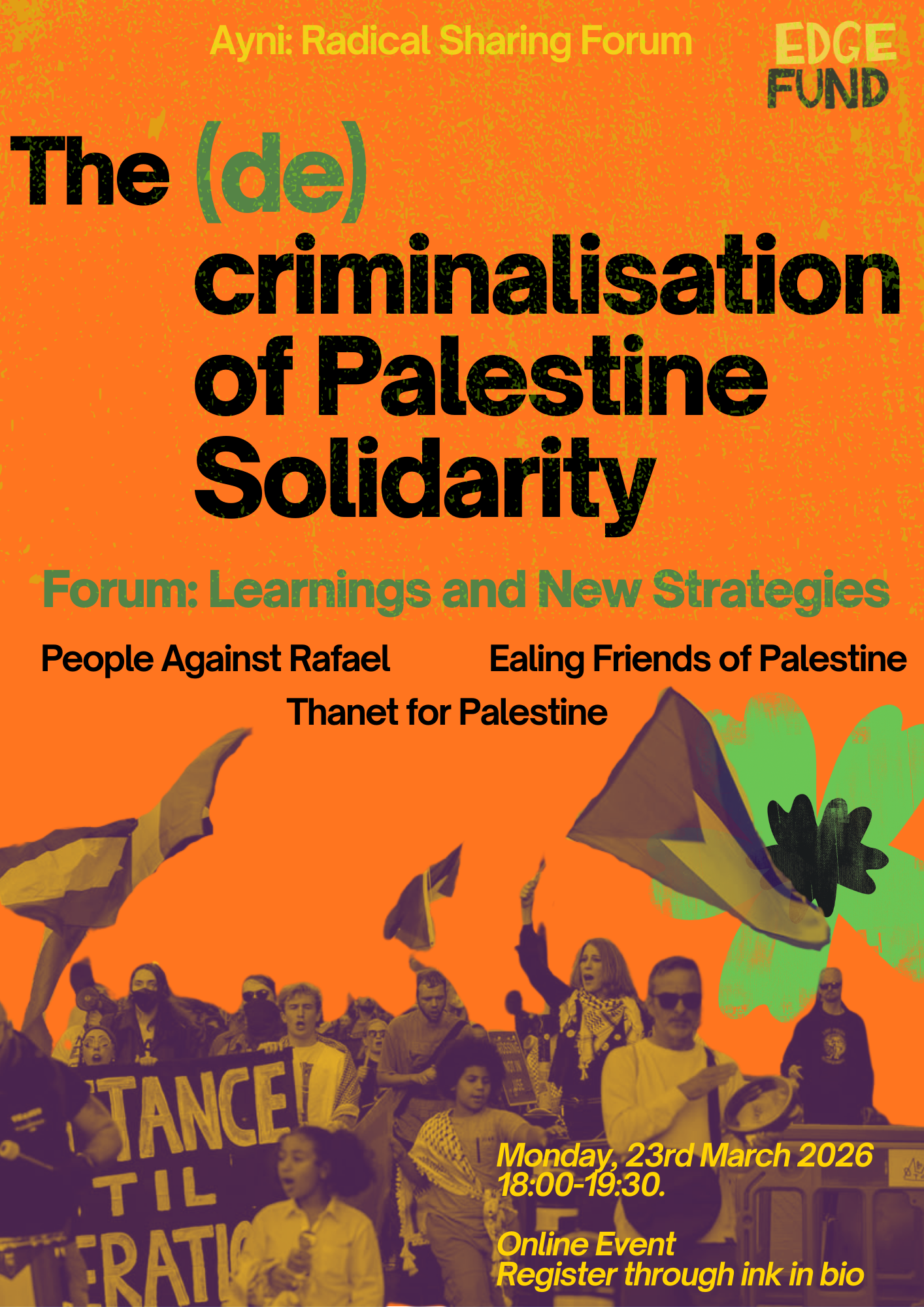 We will hear from the experience of three Edge grantees from our Roots Fund and will also have the opportunity to discuss with folks attending how to face this wave of repression against solidarity with Palestinian liberation and its broader impact on the social movements in the UK.