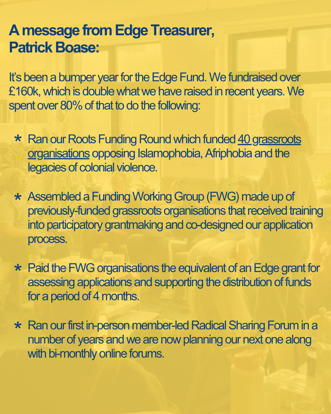 This funding round has been designed by Edge’s Funding Working Group, made of 13 organisers representing 6 grassroots groups whose aims align with the Roots Fund. They are Youth Front for Palestine, Migrant Women Press, World Stages Now, Unis Resist Border Control, Black Activists Rising Against Cuts, Queer Refugees Unite. Members of the FWG are past grantees and current members of Edge Fund. Applications will be assessed by them with support of Edge Fund.